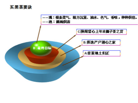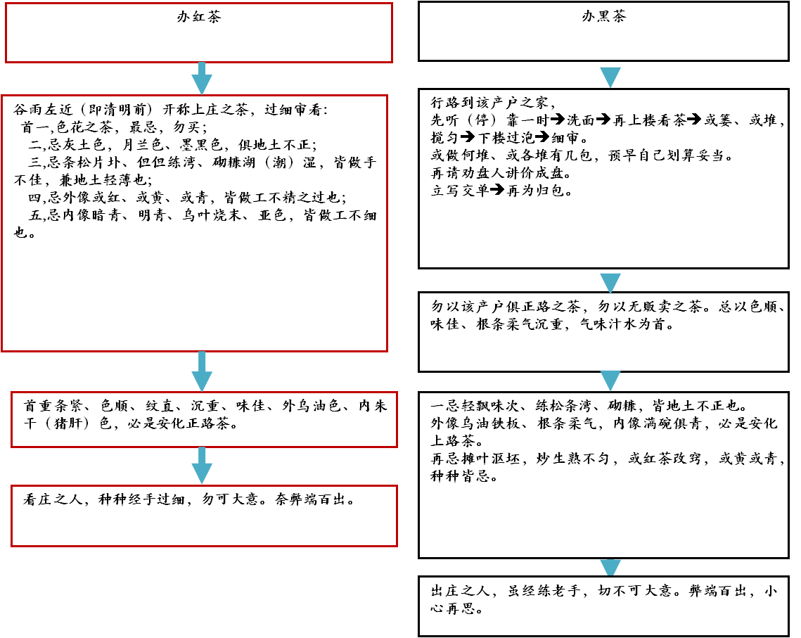 《行商遗要》的记录显示从山西祁县到湖南安化,行程约4010里,往返需2个月的时间。办茶使命的完成涉及:1、在规定的时间安全到达;2、做好选茶、购茶、制茶、包装、运输、缴税、发货的工作。办茶过程长,不确定性高,如何能保质保量地完成任务呢?晋商通过对以上办茶工作一一制定细密、清晰的操作流程,大大降低不确定性,确保了办茶工作的质量。就其中“选黑茶要诀”一点来看,晋商先是对选黑茶标准有一个总的描述:“我号买黑茶首重地土归正,择选产户潜心之家,预闻留心上年未摘子茶之货,必根条柔气,精力沉重,油水、色气、香味种种皆佳,内外明亮,满碗俱清,此茶用心切买。思维前辈老板创业招牌艰难,历年已久,宜深审辨,勿惜价而弃也。戒之!戒之!”;随后又具体说明哪里是“地土佳”的茶产地,并进一步对茶叶采摘时间、色、形、味、轻重、外像、内像、冲泡效果等都作了形象而详细的说明,且有好茶与次茶的细节对比。其层层接近、步步细化的选茶操作指南,不仅至今仍是安化茶人判别茶叶等级的经典标准,就连我们这些外行,也能据此对黑茶质量说出个一、二来。图3以简明图示的方式描述出了《行商遗要》中办红茶、黑茶的细节,供读者直观了解。