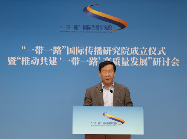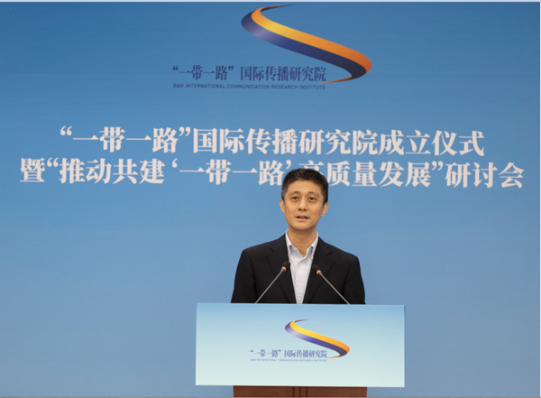 中国外文局副局长兼总编辑高岸明在中国外文局“一带一路”国际传播研究院成立仪式上讲话。