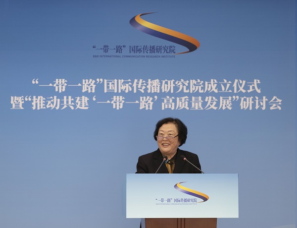 十二届全国人大外事委员会副主任委员、中国社会科学院“一带一路”国际智库专家委员会主席赵白鸽在中国外文局“一带一路”国际传播研究院成立仪式上讲话。