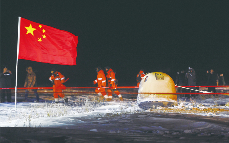 嫦娥五号任务作为我国复杂度最高、技术跨度最大的航天系统工程,首次实现了我国地外天体采样返回。图为2020年12月17日凌晨,嫦娥五号返回器携带月球样品,在内蒙古四子王旗预定区域安全着陆。 新华社记者 连振/摄