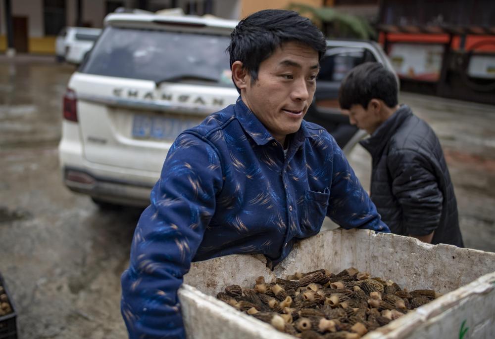 云南贡山县独龙江乡龙元村“致富能手”和晓永在乡里卖羊肚菌(2019年4月19日摄)。 新华社记者 江文耀 摄