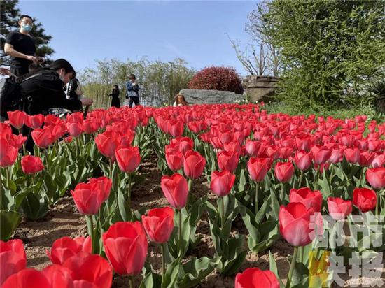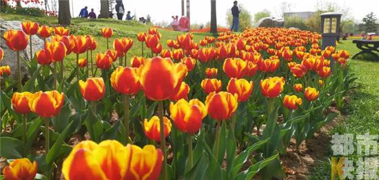 由于郁金香分早、中、晚期品种,园区在郁金香种植过程中结合了花色和花期进行搭配种植,让花色和层次显得更加丰富,让游客可以获得更多美的感受。