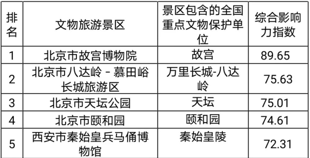 全国文物旅游综合景区影响力榜单针对文物旅游景区进行了综合评估,评选出综合影响力前十景区。榜单前十名覆盖北京、陕西、江苏、甘肃、山西等5个省市,涵盖古建筑、石窟寺、古遗址等多个类别。其中,故宫博物院、八达岭-慕田峪长城旅游区、颐和园等位于北京的景区强势占据榜单6席,故宫博物院更是以89.65分的高分位列榜首。