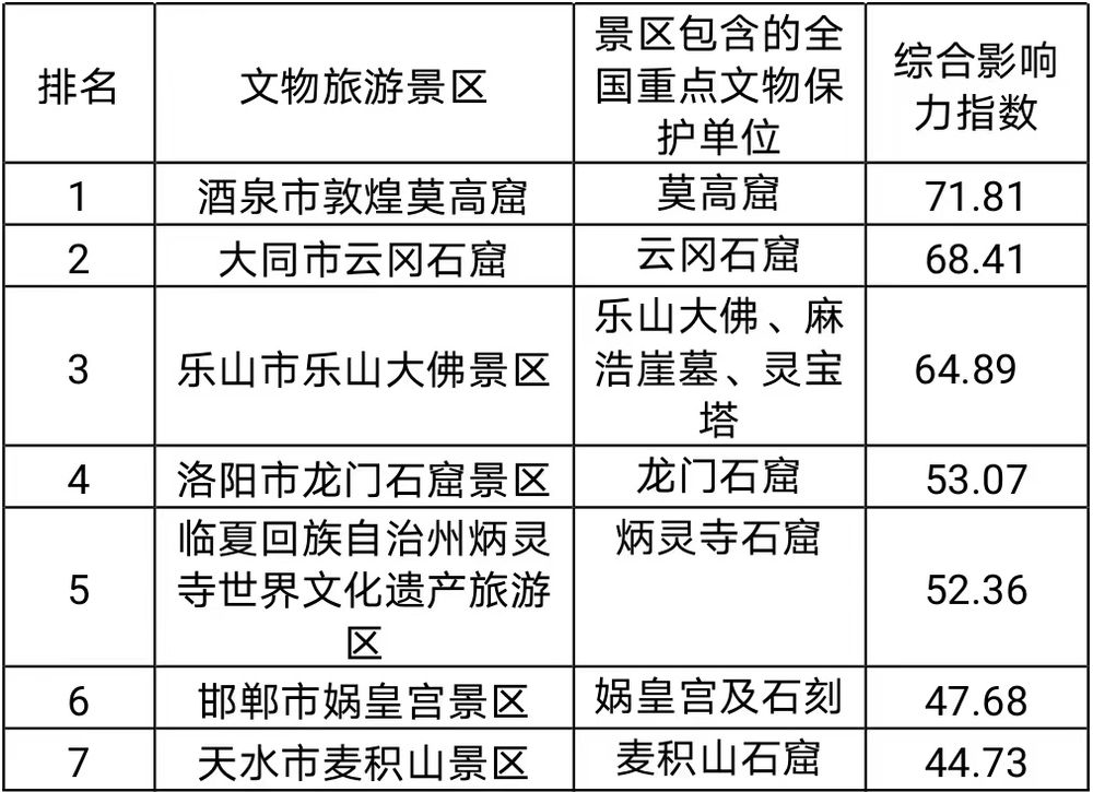 我国石窟寺及石刻体系完整、规模宏大,充分体现了中华民族的审美追求、价值理念、文化精神,是我国辉煌灿烂古代文明的集中体现,是中华文明同其他古代文明交流互鉴的历史见证。石窟寺因其卓越的历史、文化、艺术价值受到海内外游客的强烈欢迎,由于其突出的稀缺性与脆弱性,石窟寺文物旅游景区将文物保护作为首要前提。2020年国务院办公厅《关于加强石窟寺保护利用工作的指导意见》提出:坚持发展旅游以保护为前提,鼓励采用限时限流、定制服务等方式规范引导参观活动,在石窟寺类世界文化遗产、全国重点文物保护单位全面推广预约参观制。上榜旅游景区榜单中均采用限量、预约、错峰、限流等举措,有效推进文物保护与开发利用的平衡。