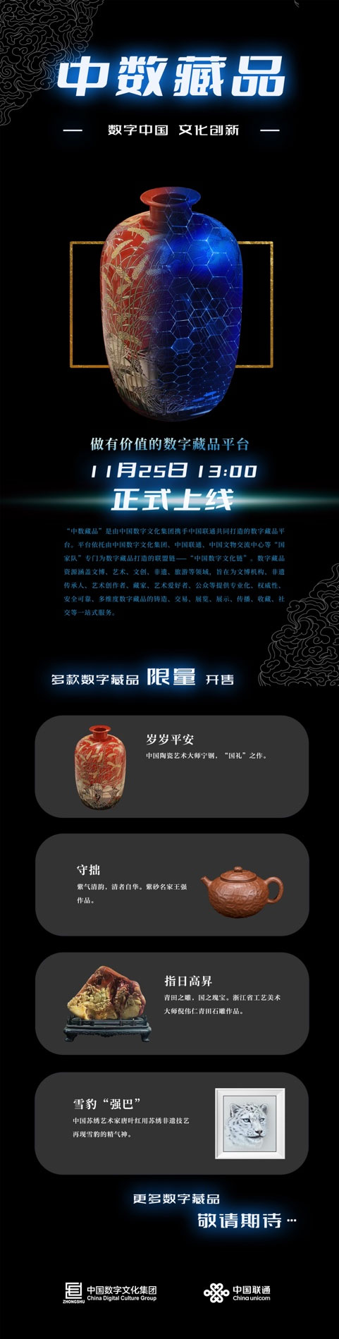 由中国数字文化集团携手中国联通打造的“中数藏品”平台将于11月25日13:00正式上线。