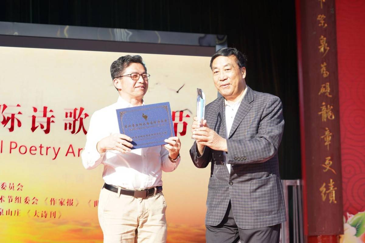 获奖诗人代表董发亮上台领奖,由中国鲁迅文学院常务副院长,当代著名作家白描颁奖