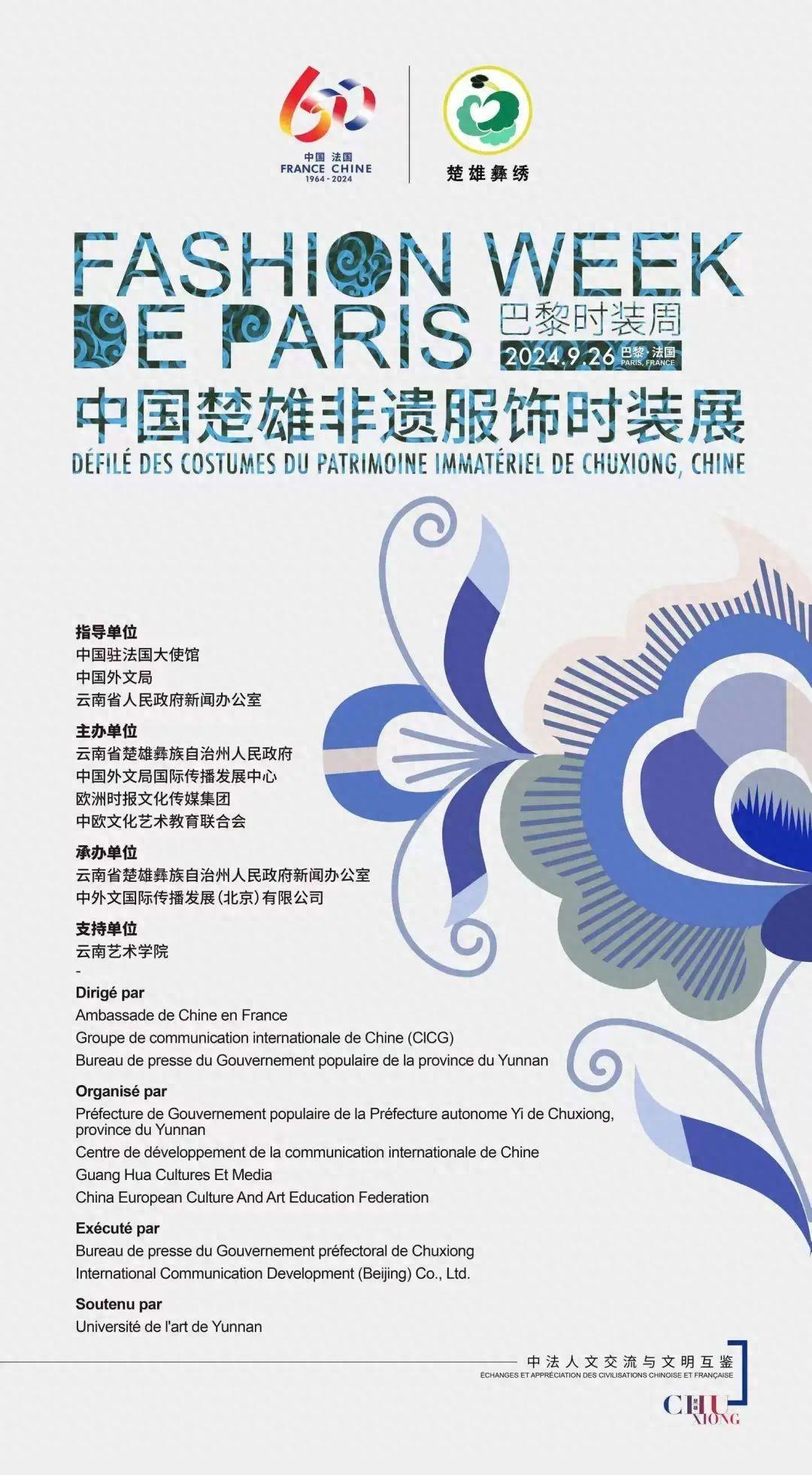 此次活动由中国驻法国大使馆、中国外文局、云南省人民政府新闻办公室指导,云南省楚雄彝族自治州人民政府、中国外文局国际传播发展中心、欧洲时报文化传媒集团、中欧文化艺术教育联合会等主办。中国驻法国大使馆公使陈栋出席时装展并宣布开幕。中国外文局国际传播发展中心副主任董彦、法国设计协会主席安妮-玛丽·萨尔盖伊等出席活动并致辞,中国驻法国大使馆、联合国教科文组织、法国文化部、法国时装协会、法国桥智库等相关机构代表以及卡地亚国际联合创始人等中法时尚艺术界、企业与媒体机构代表近百人参加活动。