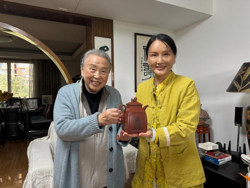 拜访期间,耿春华馆长表示,遵循您的理念,将您的建筑代表作融入紫砂壶的创作之中,期待探索出宜兴紫砂壶与博物馆建筑融合共生出新气象。首次合创的“四方乾坤壶”与“四方鼎狮壶”紫砂艺术臻品,两件作品均选取宜兴黄龙山特有的清水泥创作而成。“四方乾坤壶”壶身刚正挺拔,线条简洁流畅,尽显大气之美。壶身一面刻有中国国家版本馆西安分馆主体建筑正视图,另一面为版本馆整体鸟瞰侧视图。壶钮似乾坤钮,寓意天地广阔。“四方鼎狮壶”壶身如四方鼎,稳重端庄,壶身一面刻绘西安钟楼,一面刻绘大雁塔。壶钮以祥狮戏球为造型,寓意吉祥。两件紫砂作品构思巧妙,工艺精湛,尤其是将西安建筑之美与紫砂非遗有机融为一体,细节之处尽显匠心,既具有实用价值,又蕴含着深厚的文化底蕴。张锦秋院士对耿春华馆长的精心创作给予高度评价,为宜兴市紫泥春华博物馆及紫砂文化艺术品发展指明方向、谋划良策。